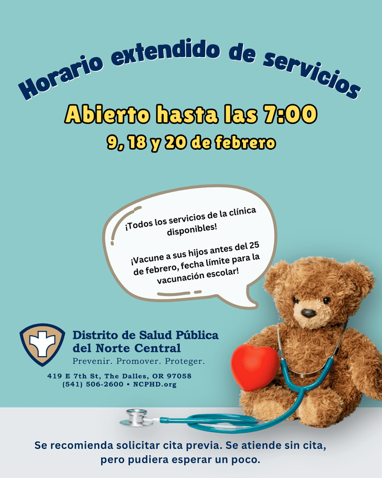 On February 25, children will not be able to attend school or childcare if they are missing immunizations. North Central Public Health District (NCPHD) encourages families to get their children’s immunizations up to date as soon as possible. To help families, NCPHD is offering extended clinic hours from 5 to 7 pm on Feb. 9, 18, and 20. All clinic services will be available. This is a great time to get your family’s school vaccines before Oregon’s Feb. 25 deadline.